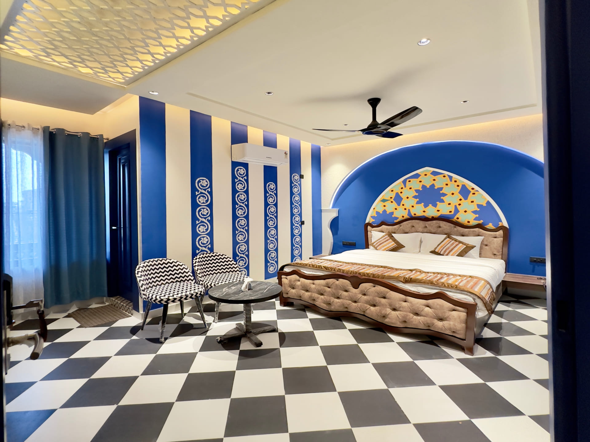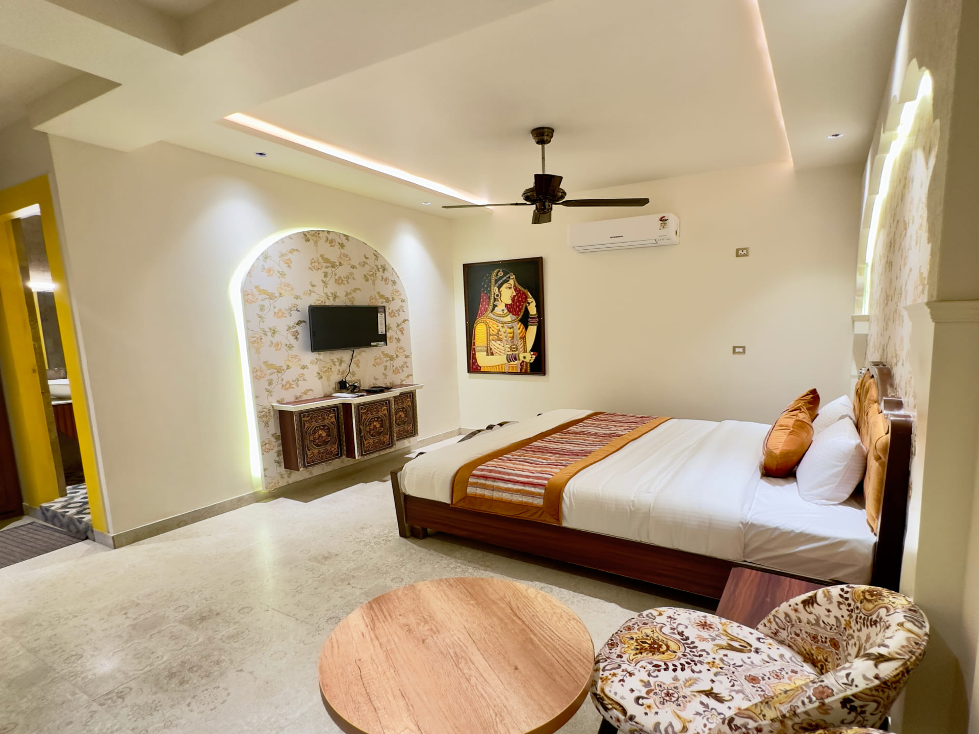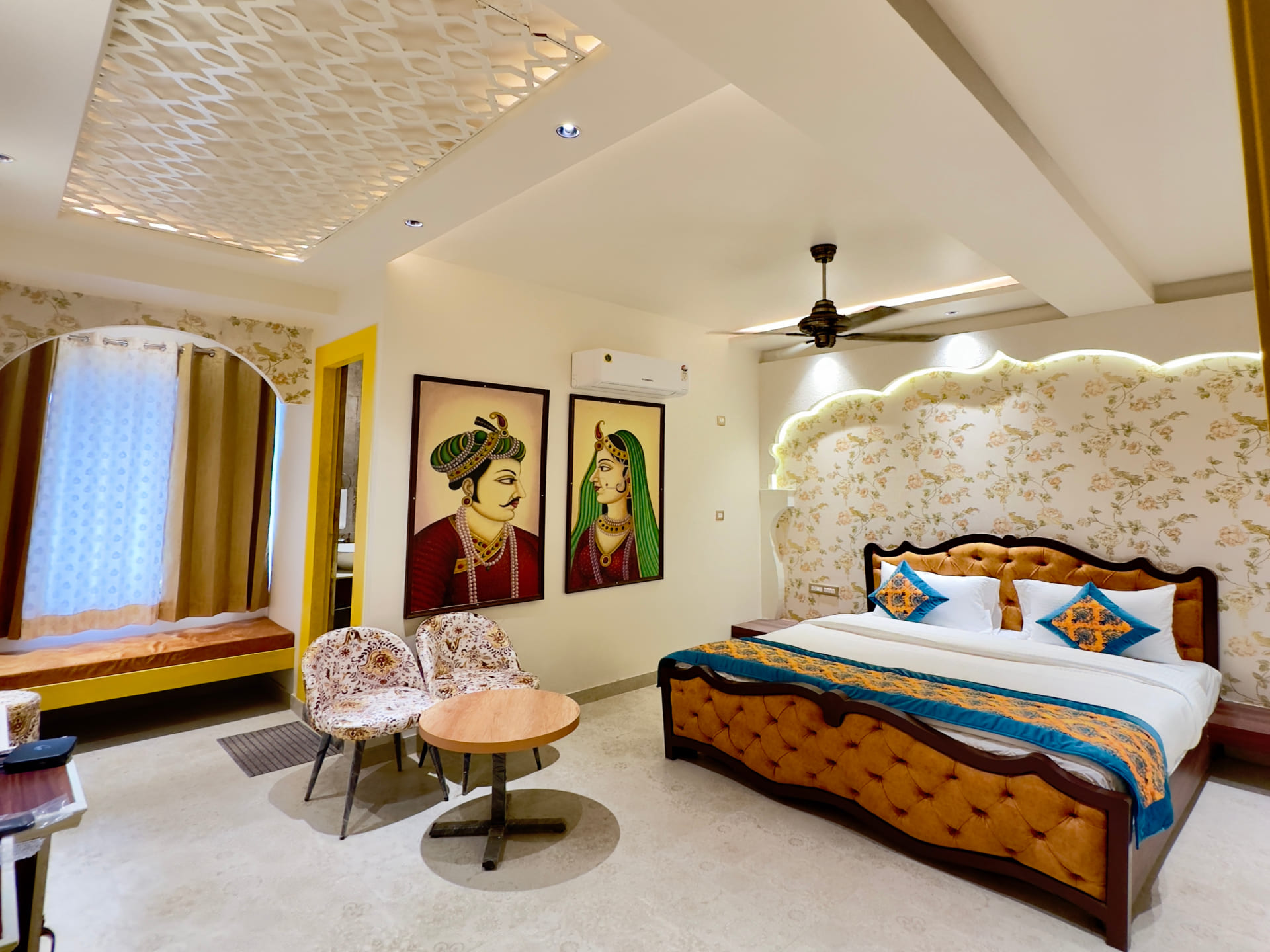 Step into luxury and comfort with our Royal Deluxe Room, where every detail is meticulously crafted to exceed your expectations. As you enter, you'll be greeted by a spacious and elegantly designed interior, adorned with tasteful décor and plush furnishings. Sink into the embrace of our sumptuous king-sized bed, fitted with premium linens to ensure a restful night's sleep. Pamper yourself in the opulent en-suite bathroom, featuring luxurious amenities and sleek modern fixtures. Indulge in a refreshing rain shower or unwind in the deep soaking tub, surrounded by marble accents and soft ambient lighting. Stay connected with complimentary high-speed Wi-Fi and enjoy your favorite shows on the 43 inch Sony Android Google LED, equipped with premium cable channels. For added convenience, a well-stocked minibar is at your disposal, offering a selection of beverages and snacks to satisfy your cravings.