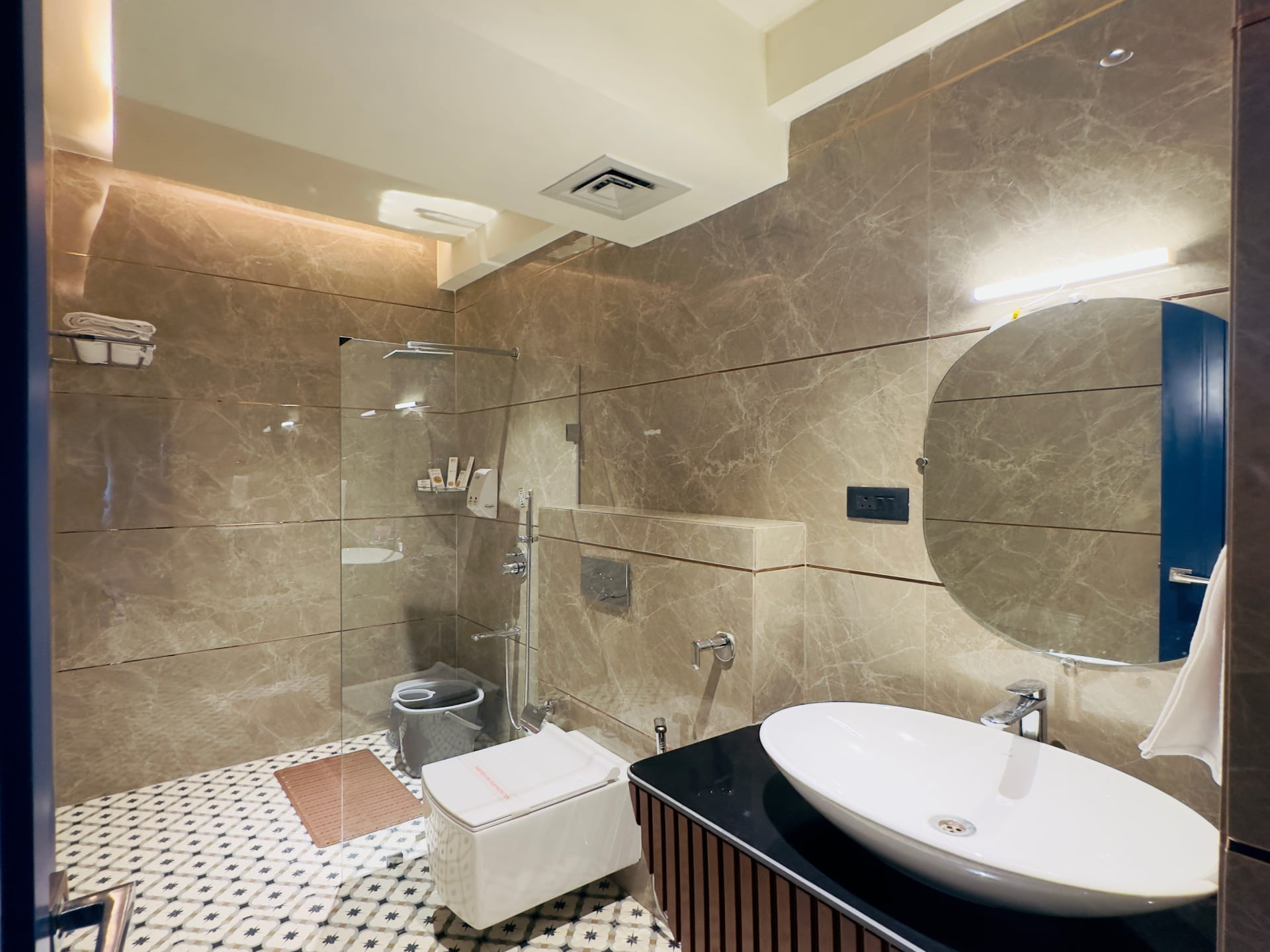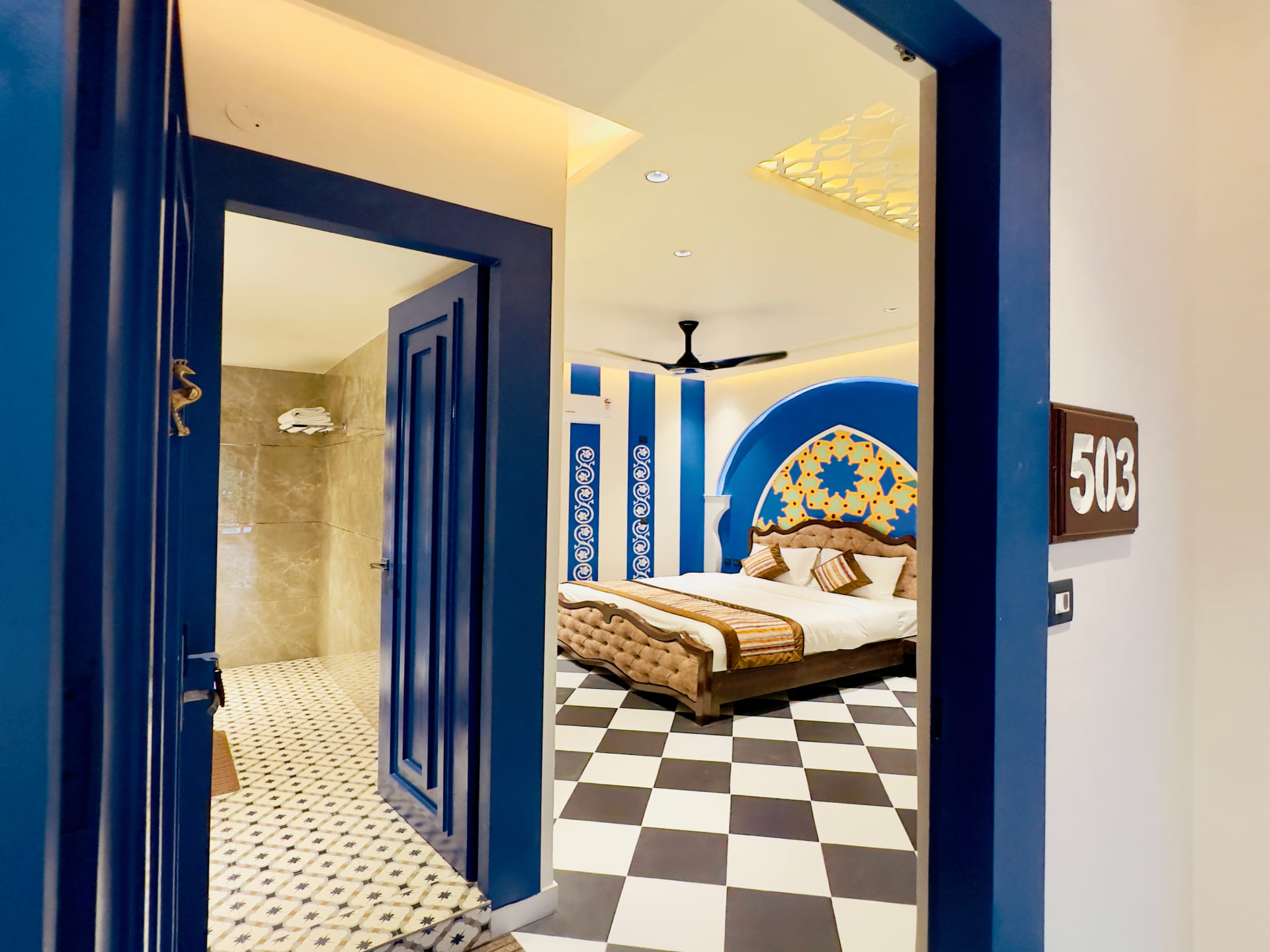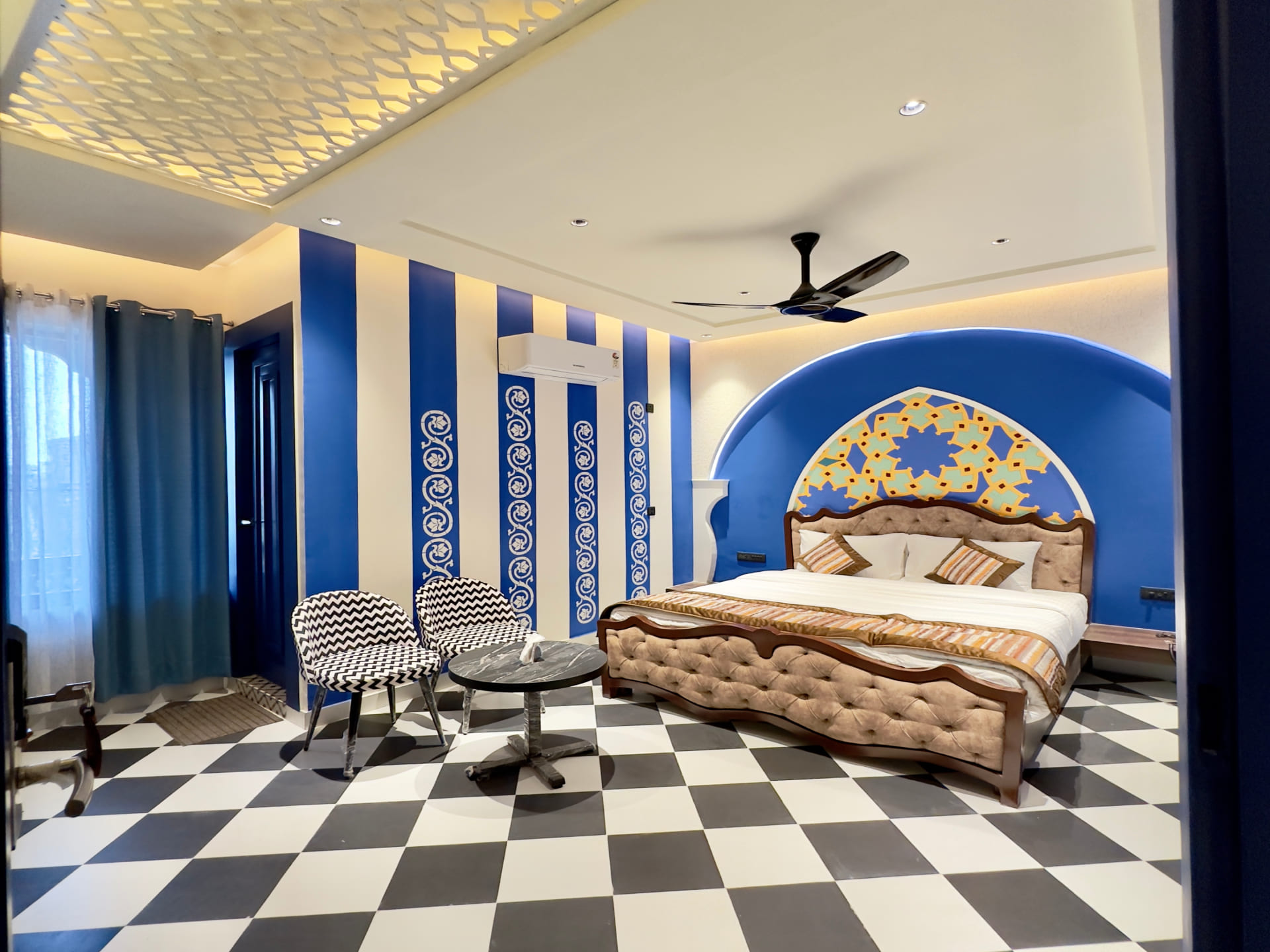 Step into luxury and comfort with our Royal Deluxe Room, where every detail is meticulously crafted to exceed your expectations. As you enter, you'll be greeted by a spacious and elegantly designed interior, adorned with tasteful décor and plush furnishings. Sink into the embrace of our sumptuous king-sized bed, fitted with premium linens to ensure a restful night's sleep. Pamper yourself in the opulent en-suite bathroom, featuring luxurious amenities and sleek modern fixtures. Indulge in a refreshing rain shower or unwind in the deep soaking tub, surrounded by marble accents and soft ambient lighting. Stay connected with complimentary high-speed Wi-Fi and enjoy your favorite shows on the 43 inch Sony Android Google LED, equipped with premium cable channels. For added convenience, a well-stocked minibar is at your disposal, offering a selection of beverages and snacks to satisfy your cravings.